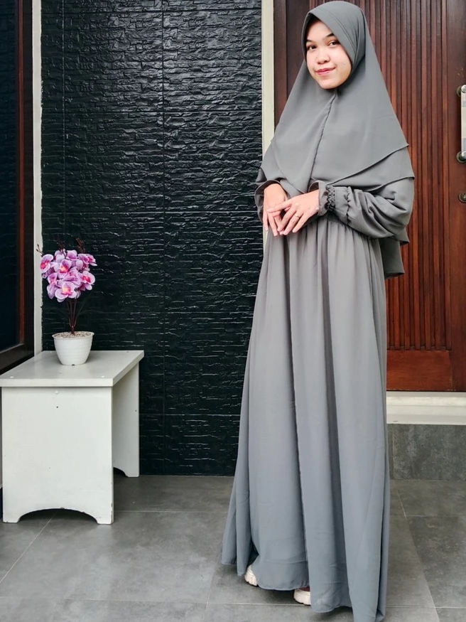 Grey Gamis Set Abaya Syari Busui Cringkle Airflow/Cadar + Pashmina+Rok+Kaftan Tunik/Setelan Gamis