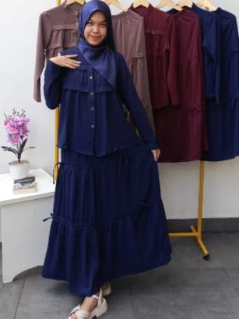 Setelan Rok Wanita Muslim Kekinian / Baju Kurung Variasi Kancing Busui / Crinkle Airflow Satu Ukuran